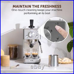 The Breville Barista Slimline Espresso Machine, model VCF185, is a compact and efficient coffee maker perfect for creating a variety of espresso-based drinks at home. With an integrated milk frother, this machine allows you to easily create creamy foam for your lattes and cappuccinos. The 1.1L water tank capacity and included filter baskets, coffee tamp, and cleaning pin ensure you have everything you need to start brewing delicious espresso drinks. The sleek silver design adds a touch of style to any kitchen, making this espresso machine a convenient and practical choice for coffee lovers.