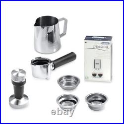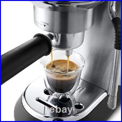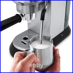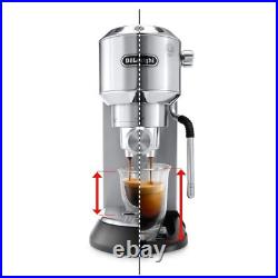 Water Capacity in Liters: 1.1. Pod Compatible: Easy Serving Espresso Pods. M Dedica Arte Manual Espresso Coffee Maker a masterpiece in silver that brings the artistry of espresso brewing to your kitchen. Crafted with precision and elegance, this coffee maker is designed for those who appreciate the perfect balance of form and function. The Dedica Arte features a manual espresso brewing system, allowing you to tailor each cup to your exact preferences.The included milk frother adds a touch of luxury, enabling you to create creamy lattes and cappuccinos with ease. The silver finish adds a touch of sophistication to your countertop, making it a stylish addition to any kitchen. With its compact design, the Dedica Arte effortlessly fits into your space, while the durable construction ensures years of reliable performance. Elevate your coffee experience with the Delonghi EC885. M Dedica Arte Manual Espresso Coffee Maker where artistry meets the joy of brewing in every cup.