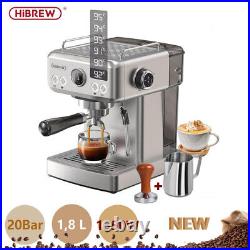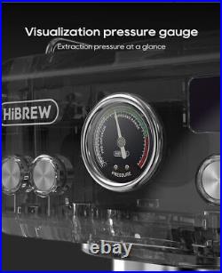 Pressure gauge: Monitors pressure at a glance. Multifunctional LCD display: Displays all settings and doubles as a shot timer. Temperature unit switch: Easily toggle between Fahrenheit and Celsius. Oz water reservoir: Reduces the need for frequent refills. Hot water dispensing: Use the steam wand to quickly dispense hot water for tea or Americanos.UP to 20 Bar Pressure and Stainless Steel Body: The HiBREW espresso machine utilizes a powerful high-pressure pump and uniformly moist pre-infusion technology to ensure that the coffee cream is fully extracted. The coffee maker has a robust brushed stainless steel body that is structurally stable, resistant to dirt and easy to clean. Professional Programmable Functions & Coffee Bean Adaptability: This semi-automatic espresso machine can adjust the amount of coffee, extraction temperature, steam temperature and pre-infusion time. The rich programming functions help you adjust the acidity and bitterness of the coffee that suits you. Even with coffee beans of different flavors, this programmable coffee machine can help you extract their flavors.