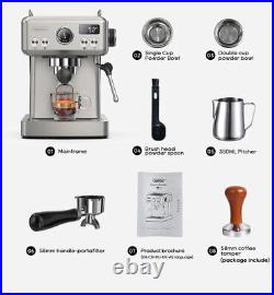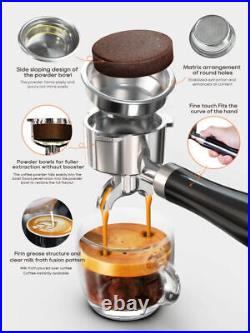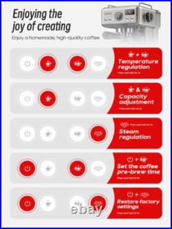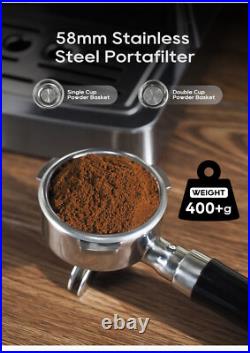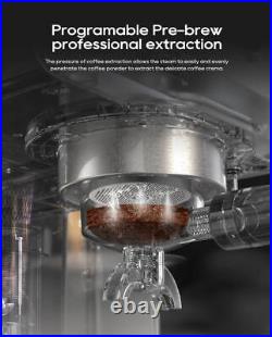 Optional Program Range: single cup 25150ml, double cup 50300ml; hot extraction temperature range 194°F204°F, cold extraction range 77°F; steam temperature range: 257°F302°F; pre-infusion time range: 010 seconds; temperature display conversion:? Can be converted to each other. Powerful Steam System: The coffee machine is equipped with a steam wand for making milk froth, which can rotate freely at 270°. The high-pressure steam at 257°F302°F can quickly produce dense hot milk froth, which improves the success rate of latte arts. The detachable design of the steam head can be easily cleaned to avoid clogging and milk corrosion.58mm Stainless Steel Portafilter: Portafilter head made of high quality stainless steel with no plastic inside. Compatible with more accessories for commercial coffee machines, while ensuring that the coffee liquid does not pass through the plastic, providing a very high degree of playability and flavor consistency.